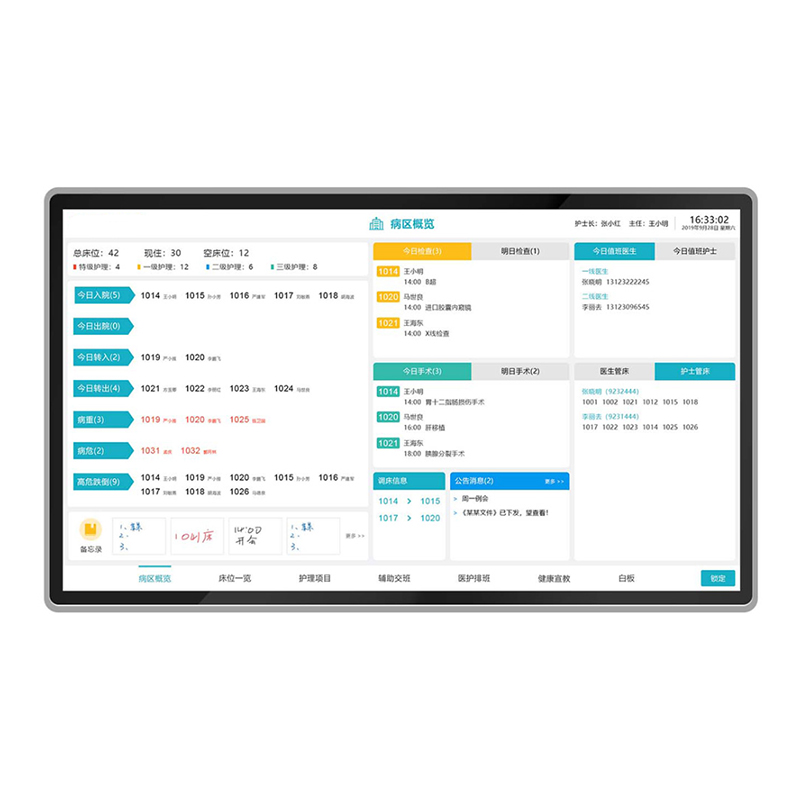 1. 采用65英寸高精度触摸显示屏,设计简洁,支持壁挂式安装,可无缝集成于护士站环境。为满足灵活部署需求,亦可选配专用落地支架(需另购),实现移动或固定 点位部署。 2. 作为系统的核心显示终端,其核心应用之一是床垫监测一览表。该功能能够集中、清晰地展示病区内所有患者的床垫监测状态(如离床、体动、心率、呼吸等)。 3. 具备强大的信息显示与数据处理能力。支持实时从系统后台同步并更新患者数据与报警信息,确保医护人员查看到的信息始终是最新的。同时,其触摸交互能力允许 医护人员直接在屏幕上进行点选、确认等快捷操作,实现信息交互与闭环管理。 4. 通过大屏可视化,将关键信息集中呈现,极大地提升了护士对病患状态的感知能力与工作效率,是构建智能化病房的重要一环。