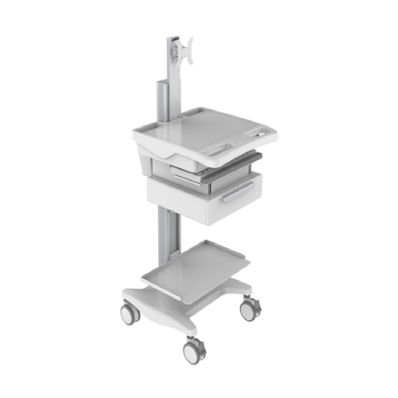 1.可用于固定床旁终端。 2. 台面材料为ABS塑料,一次成型注塑成型。 3. 台车高度(平台高度)800-1200mm可调,脚踩气动升降系统。 4. 摇臂可单独调节,升降区间在500mm以内,前后可伸缩。 5. 台车轮子使用医院静音轮,可以任何方向灵活推动,两个轮子带锁定功能,便于稳定在固定的位置。 6. 电池安装在车底盒内,采用锂电池或UPS电源方式,可支持12V输出供电,可只持续工作8小时。
