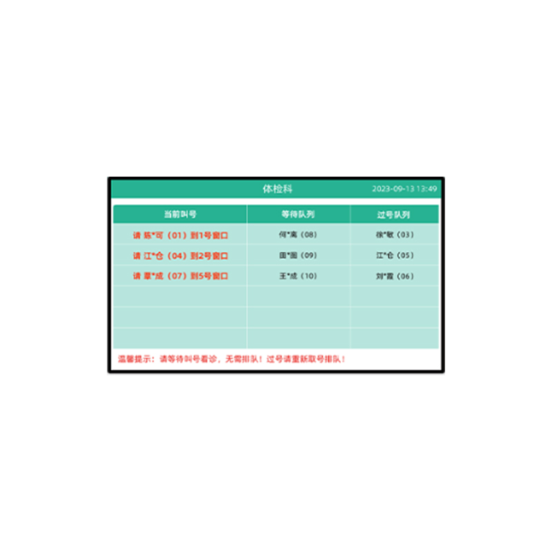 1. 32寸显示屏,支持滚动显示当前呼叫、等待、过号的排队叫号信息。 2. 支持显示日期时间信息。 3. 支持全屏或分区域播放多媒体视频文件。 4. 支持显示等候人员的排队号码、姓名和科室信息。 5. 支持排队叫号时立即全屏显示排队叫号信息,过一定的时间间隔,再播放视频文件。 6. 可在屏幕下方滚动显示的礼貌用语或其它通知类即时文字信息等。 7. 可与多媒体信息同屏显示。 8. 可对特殊诊区敏感信息隐私保护。