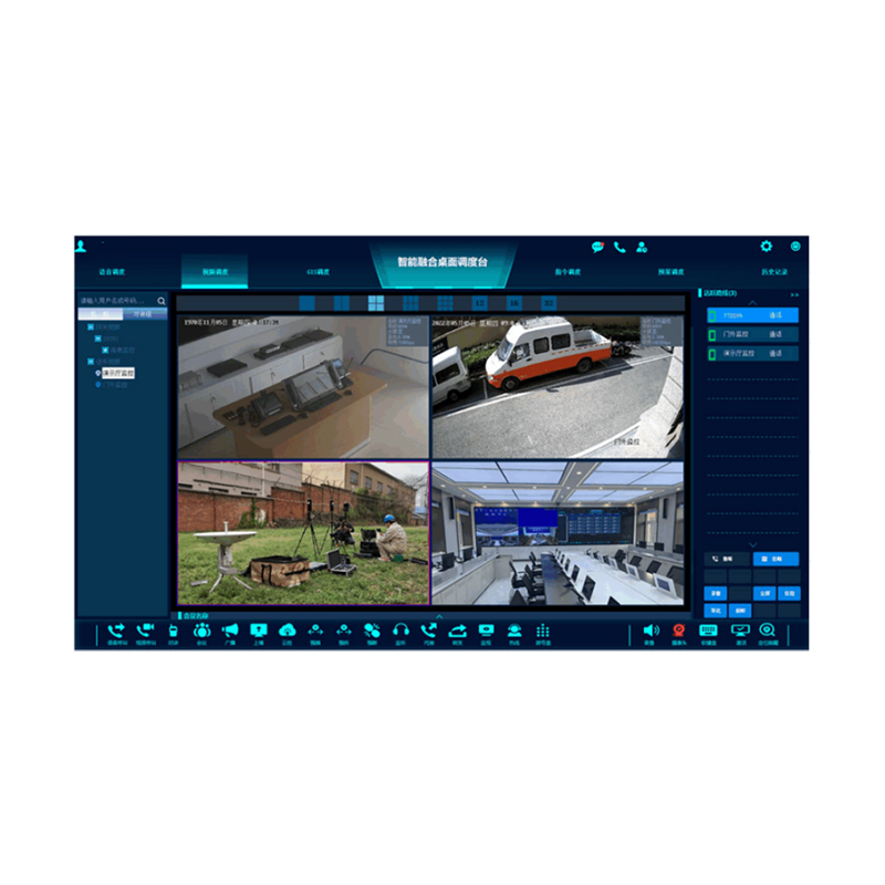1. 采用B/S架构,可灵活部署。 2. 视频通话:视频话机间的视频通话,与智能APP的视频通话。 3. 视频分发:将各种视频源分发到不同的显示设备上,方便指挥调度时现场情况的把握。 4. 公网集群对讲:单呼,组呼,会议,SOS,临时组。 5. 广播系统接入:IP广播,传统广播,SIP广播,会议调音台。 6. 地图引擎:在线地图,离线地图,三维地图。 7. 地图调度:地图上操控对讲,语音通话,视频通话,调看现场视频,发送消息,电子围栏,圈选等操作。 8. 定位数据:轨迹回放,位置上报,信息标注,数据导出。 9. 文字消息:支持以文字的方式,向被调度人员智能终端进行交互。 10. 多媒体消息:支持以语音、视频、图片的方式与被调度人员进行交互。 11. 文件消息:支持发送各种格式的文件方式与被调度人员进行交互。