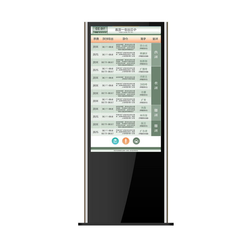 1. 采用一体化设计。 2. 排班显示软件可以根据用户的需求灵活定制显示画面效果,字幕形式,颜色风格等。 3. 支持滚动或翻页显示排班信息。支持显示日期时间信息。 4. 支持全屏或分区域播放多媒体视频文件。 5. 可在屏幕下方滚动显示的礼貌用语或其它通知类即时文字信息等。 6. 可更改显示内容的字体、大小、颜色及位置。 7. 可自定义显示背景图片,显示界面风格、样式可根据医院需求定制。 8. 显示方式:竖屏,可单独显示,可整体显示画面。 9. 可显示医生照片、医生姓名、职称、科室、专家介绍、出诊时间等内容信息。