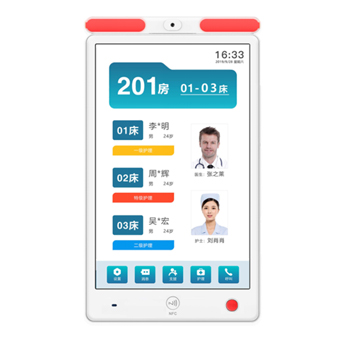 1. 采用15.6寸高清液晶触摸屏,安装在病房门上。 2. 自带三色门灯,可按不同的护理级别及呼叫类型显示不同的颜色。 3. 可显示当前日期和时间、房间号、病床号、病人姓名等基本信息。 4. 可显示该房间的责任护士姓名、责任医生姓名,并能查看该房间的责任护士照片、责任医生照片,查看科室资料简介。 5. 支持护士简易工作站功能,接听呼叫、未处理事件处置等。 6. 支持一键呼叫医护主机或护理呼叫。 7. 护理功能,医护人员可通过病房门口机标示护理状态。 8. 支持接收宣教文本及视频。 9. 可与HIS链接,获取显示数据等。