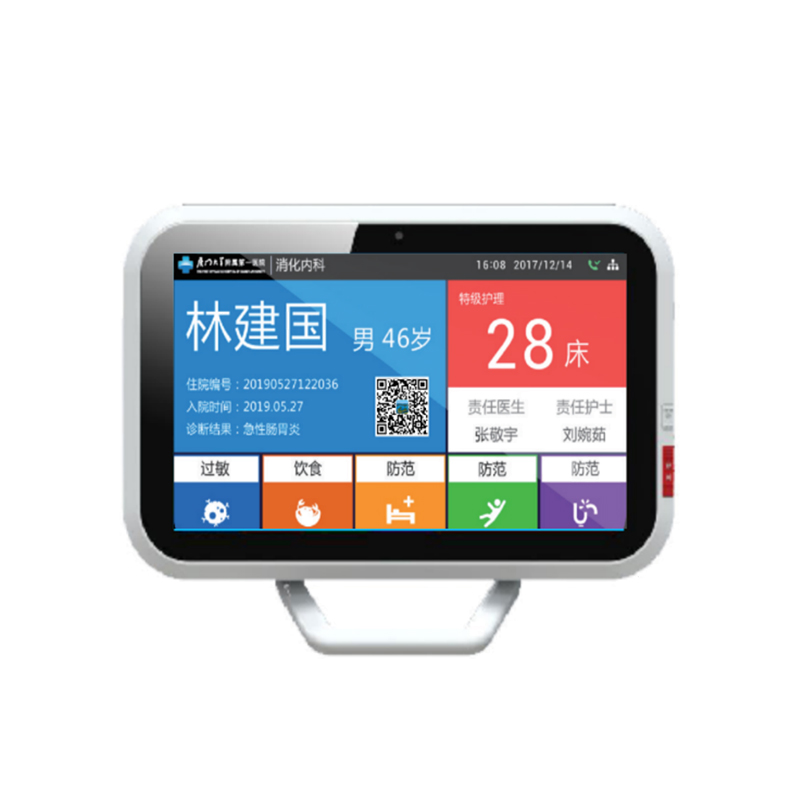 1. 一键呼叫:患者可一键呼叫护士站探视管理主机。 2. 高清可视:可与护士站探视管理主机、家属分机进行全高清全双工双向可视对讲,对讲方式免提。 3. 信息显示:自动同步HIS数据,显示患者的信息供医护人员查看。 4. 信息发布:自动接收医院发布的宣教信息。 5. 点播直播:可以观看直播节目和点播视频。 6. 健康宣教:可以查看健康科普知识,类型包含视频和文章。 7. 录音录像:可将通话时的音视频数据实时传输到音视频存储服务器进行存储,并提供查询、播放功能。