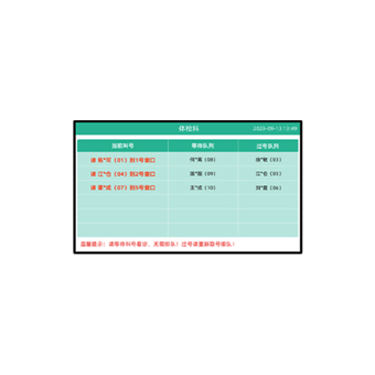 1. 32寸显示屏,支持滚动显示当前呼叫、等待、过号的排队叫号信息。 2. 支持显示日期时间信息。 3. 支持全屏或分区域播放多媒体视频文件。 4. 支持显示等候人员的排队号码、姓名和科室信息。 5. 支持排队叫号时立即全屏显示排队叫号信息,过一定的时间间隔,再播放视频文件。 6. 可在屏幕下方滚动显示的礼貌用语或其它通知类即时文字信息等。 7. 可与多媒体信息同屏显示。 8. 可对特殊诊区敏感信息隐私保护。