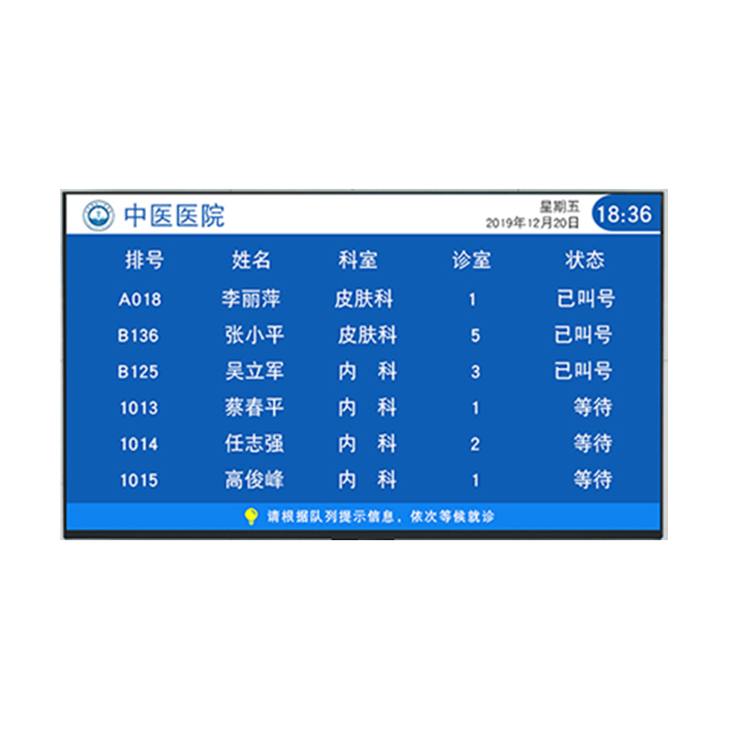 1. 43/50/55寸显示屏,支持滚动显示当前呼叫、等待、过号的排队叫号信息。 2. 支持显示日期时间信息。 3. 支持全屏或分区域播放多媒体视频文件。 4. 支持显示等候人员的排队号码、姓名和科室信息。 5. 支持排队叫号时立即全屏显示排队叫号信息,过一定的时间间隔,再播放视频文件。 6. 可在屏幕下方滚动显示的礼貌用语或其它通知类即时文字信息等。 7. 可与多媒体信息同屏显示。 8. 可对特殊诊区敏感信息隐私保护。